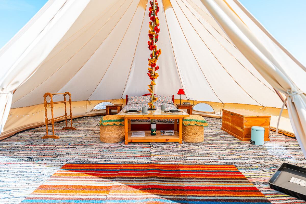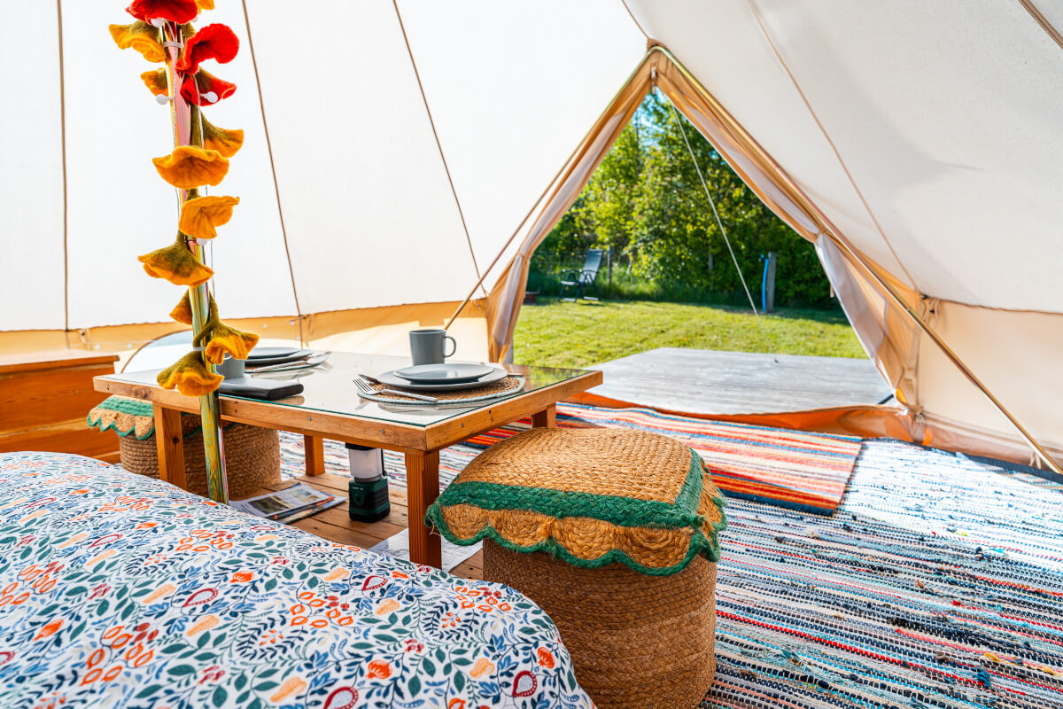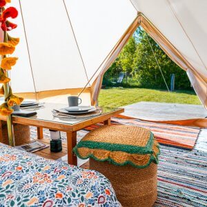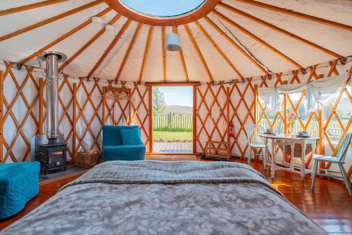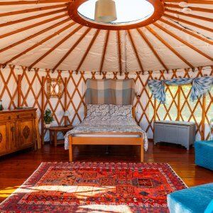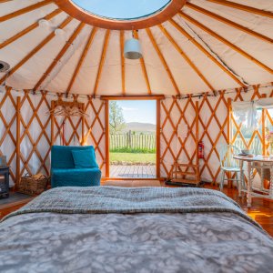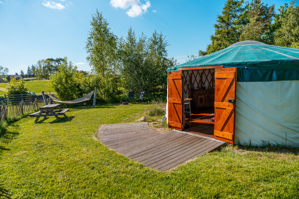 There are two glamping accommodations in a meadow of their own with a little woodland behind and friendly sheep for neighbours.