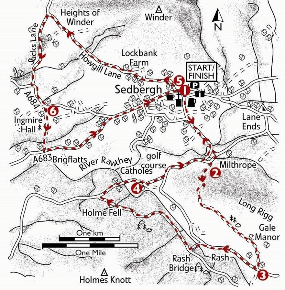 1. Take the Dent road to the south then southeast for 800m to the bridge over the River Rawthey. Cross the bridge and follow the road round to the Millthrop turning. Turn left and follow it to a T-junction in the village. Turn right and take the road southwest through Millthrop a short distance to a bridleway on the left.