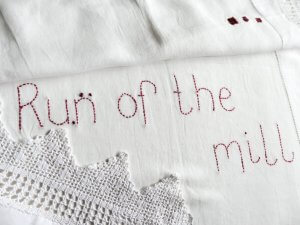 Text & Textile! is an engaging exhibition by Connie Flynn that explores the unexpected connections between language, history, and the textile industry. Inspired by familiar everyday phrases, Flynn’s research revealed that many expressions commonly used today originate from textile production and mill culture. These discoveries form the foundation of a body of work that combines text and cloth in thoughtful, tactile ways.